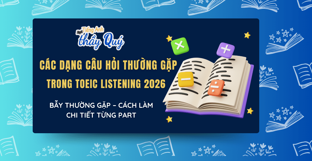 Dành cho các bạn nào đang có ý định luyện thi hay học TOEIC online cấp tốc cho kỳ thi sắp tới, hiện Tiếng Anh Thầy Quý đang có mở một luyện thi hoàn toàn miễn phí. Chương trình cộng đồng do group GIẢI ĐỀ TOEIC CẤP TỐC 2026 và Giải đề ETS 2026 đồng tổ chức và tài trợ. Chương trình gồm 16 buổi luyện đề ETS cho các thành viên mới của nhóm, với mục đích nhằm hỗ trợ các bạn MỚI ÔN TOEIC và SẮP THI làm quen với cấu trúc đề, ôn luyện lại cách thức làm bài, bí quyết luyện thi được tích lũy từ kinh nghiệm của các thầy cô hay anh chị đi trước. Xem thêm thông tin chi tiết các khóa học bên dưới nhé.