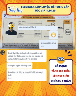 Bá Mạnh lớp luyện đề TOEIC cấp tốc VIP LD120 tăng 100 điểm đạt 535 chỉ sau 2 tuần