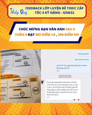 Vân Anh lớp luyện đề TOEIC 4 kỹ năng GSW32 đạt 865 điểm LR và 290 điểm SW chỉ sau 6 tuần