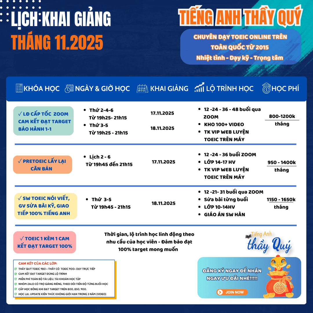 Khai giảng các lớp ôn thi TOEIC từ cơ bản đến nâng cao được hướng dẫn luyện đề chuyên sâu, trung tâm đang có hỗ trợ voucher lên đến 40% khóa học TOEIC Online khai giảng ngày 17/11/2025 tại Tiếng Anh Thầy Quý, cho các học viên đăng ký sớm nhất!