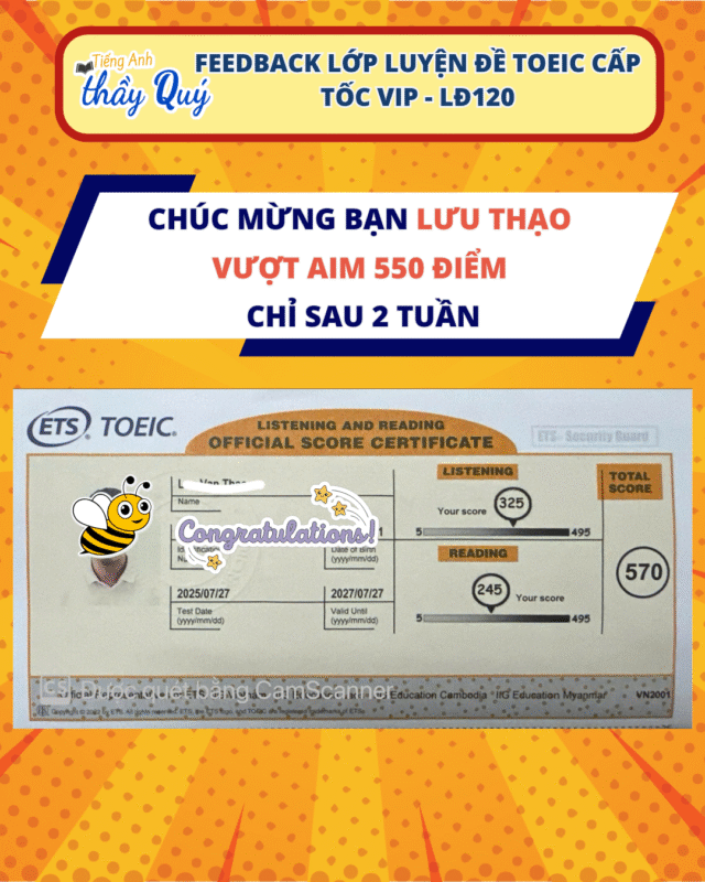 Dành cho các bạn nào đang có ý định luyện thi hay học TOEIC online cấp tốc cho kỳ thi sắp tới, hiện Tiếng Anh Thầy Quý đang có mở một luyện thi hoàn toàn miễn phí. Chương trình cộng đồng do group GIẢI ĐỀ TOEIC CẤP TỐC 2025 và Giải đề ETS 2025 đồng tổ chức và tài trợ. Chương trình gồm 16 buổi luyện đề ETS cho các thành viên mới của nhóm, với mục đích nhằm hỗ trợ các bạn MỚI ÔN TOEIC và SẮP THI làm quen với cấu trúc đề, ôn luyện lại cách thức làm bài, bí quyết luyện thi được tích lũy từ kinh nghiệm của các thầy cô hay anh chị đi trước. Xem thêm thông tin chi tiết các khóa học bên dưới nhé.