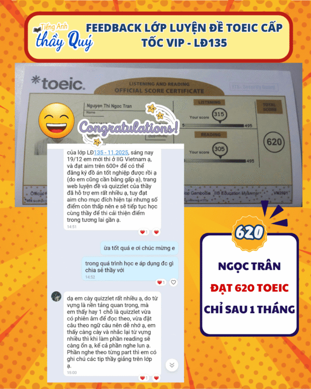 “Em mới thi ở IIG Vietnam sáng 19/12 và đã đạt hơn 600+ để kịp đăng ký đồ án tốt nghiệp. Web luyện đề và Quizlet của thầy hỗ trợ em rất nhiều. Tuy đạt aim nhưng em sẽ tiếp tục học để cải thiện điểm cao hơn.” Kết quả: