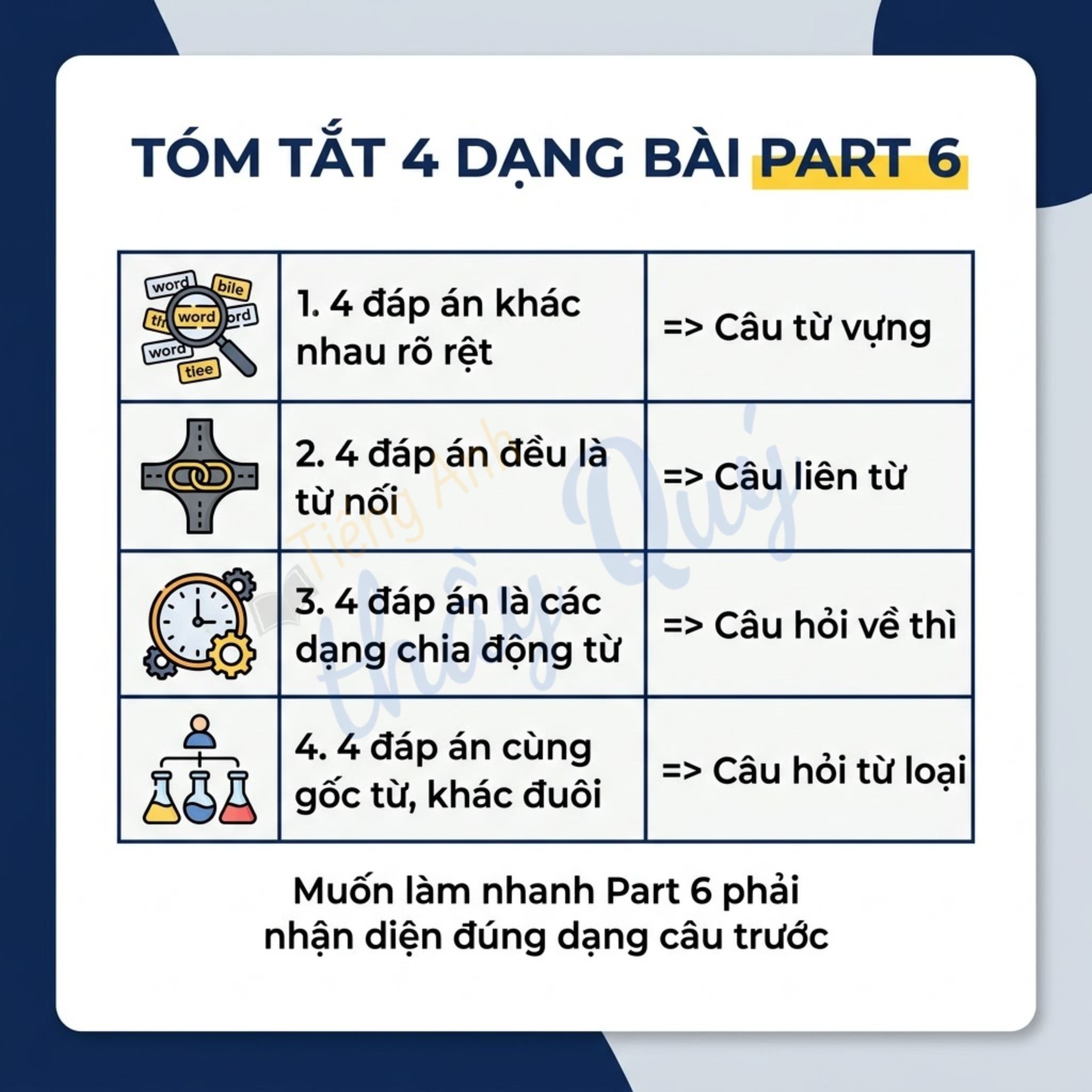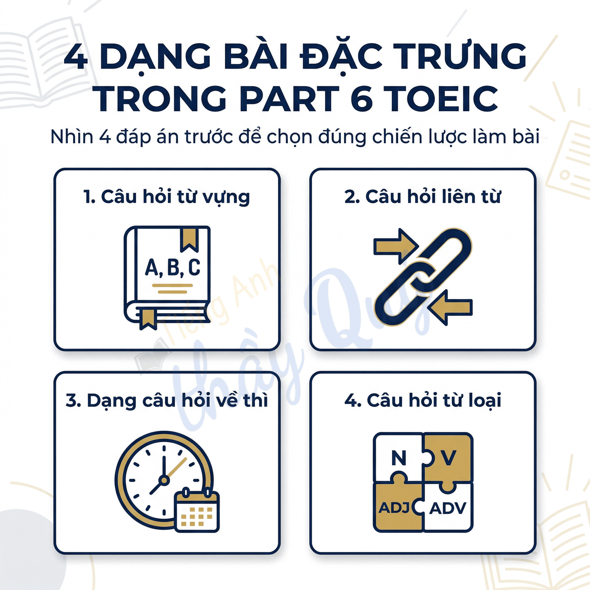 Bài viết này trình bày chi tiết cách nhận diện và xử lý 4 dạng bài quan trọng trong Part 6, giúp bạn tăng tốc độ làm bài và cải thiện độ chính xác.