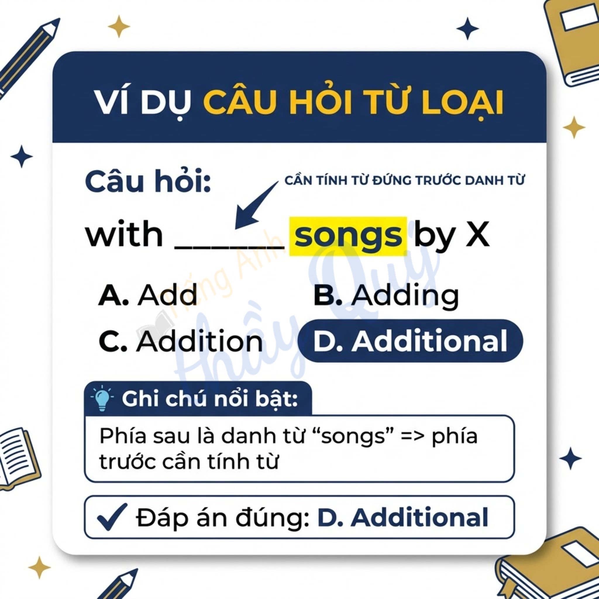 Trong cụm “additional information”, từ cần điền là tính từ bổ nghĩa cho danh từ “information”.