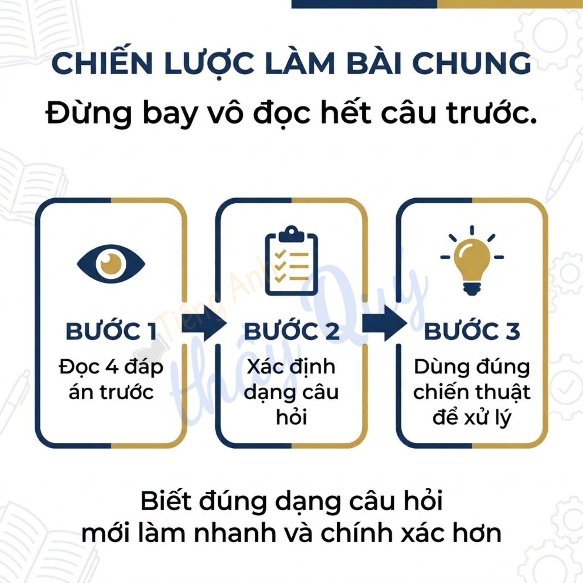 Điểm mấu chốt khi làm phần này là không xử lý tất cả câu hỏi theo cùng một cách. Thay vào đó, cần phân loại câu hỏi để áp dụng chiến thuật phù hợp.