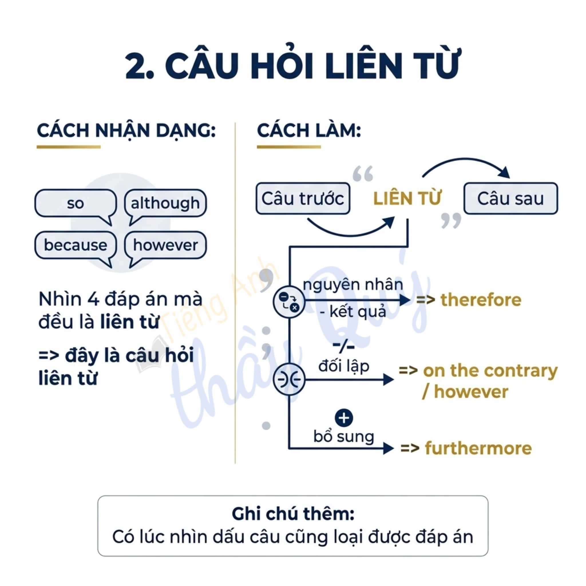 - 4 đáp án là các từ nối như however, therefore, furthermore, otherwise