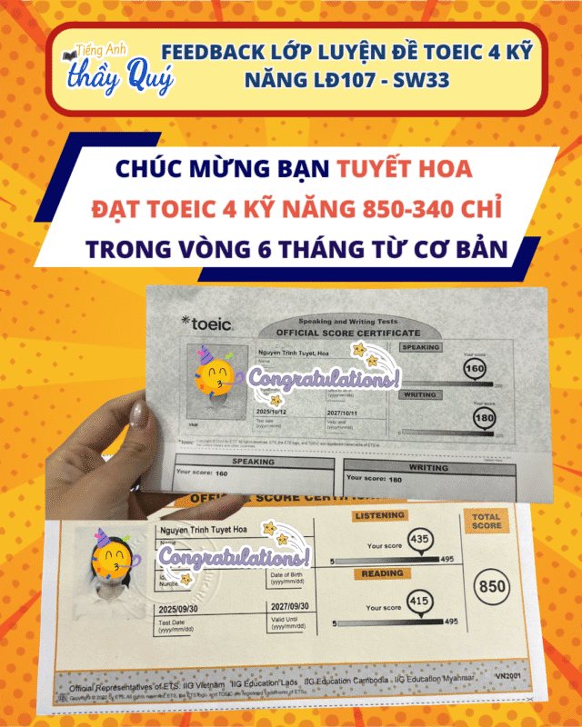 Chúc mừng bạn Tuyết Hoa đã xuất sắc đạt TOEIC 4 kỹ năng 850 – 340 chỉ trong 6 tháng, từ mức cơ bản!